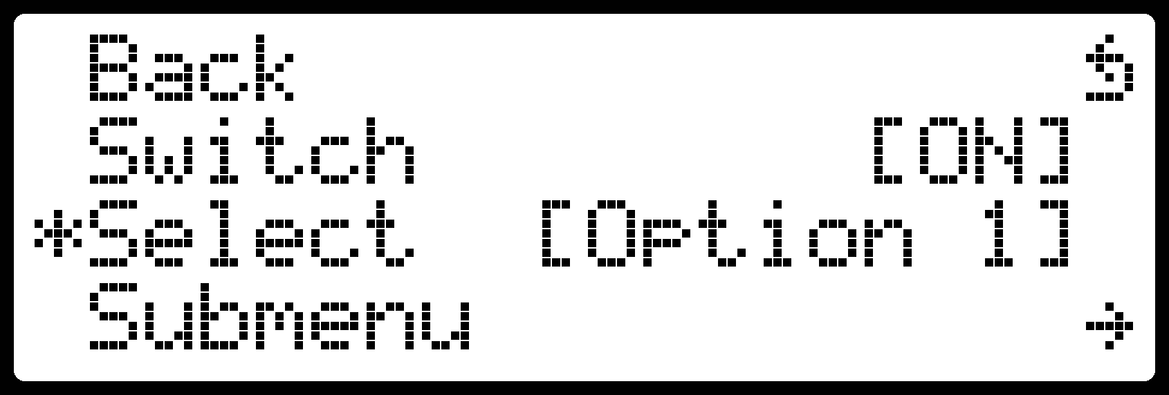 8to reference one at position0to avoid problems with zeros in a string). Defaults to0x5e(^).mark_selected (Optional, 0-255): Code of the character used to mark menu item selected. Defaults to