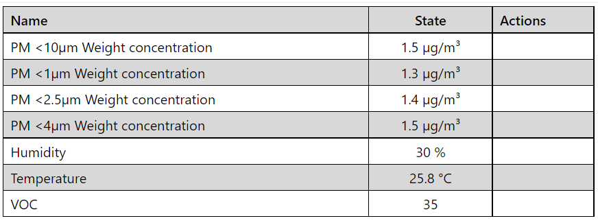 pm_2_5 (Optional): The information for the Weight Concentration sensor for fine particles up to 2.5μm. Readings in µg/m³.