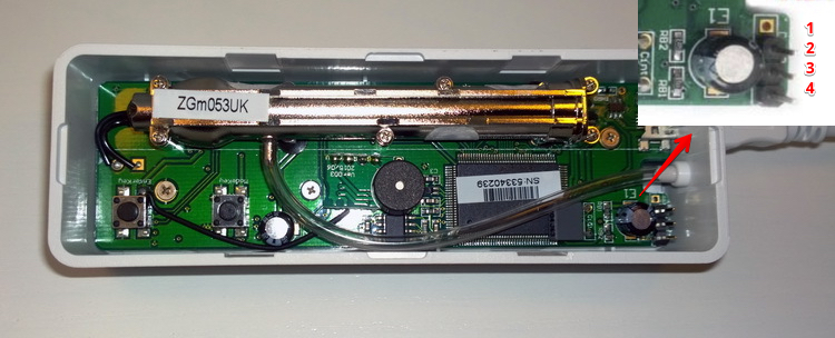 ZyAura ZGm053U connection diagram (1 - empty, 2 - clock, 3 - data, 4 - GND). In some other models the clock and data pins are swapped.¶