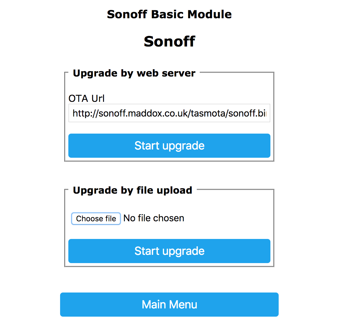 To upload the binary, navigate to the Tasmota web interface and enter the “Firmware Upgrade” section.