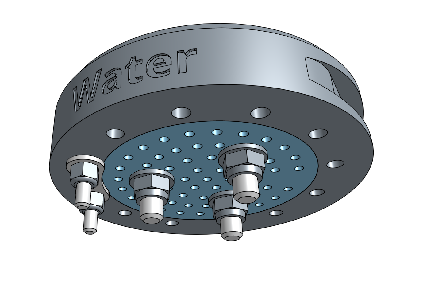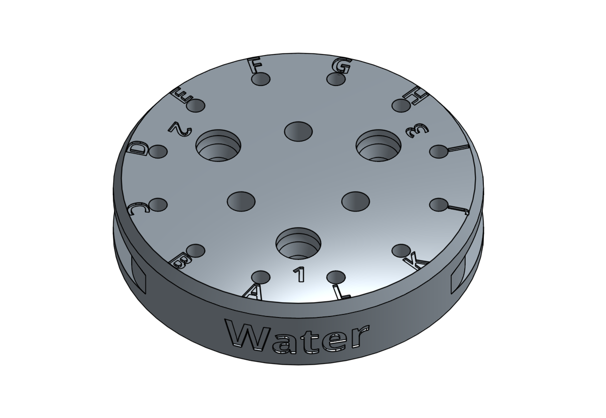 Align the watering nozzle bottom with the watering nozzle top such that the M5 holes for the magnets are aligned. Note that there are a few small nozzle holes missing from the watering nozzle bottom. The missing holes should be located directly below the liquid/gas port labelled “3” on the watering nozzle top (where the water will come in from the UTM).