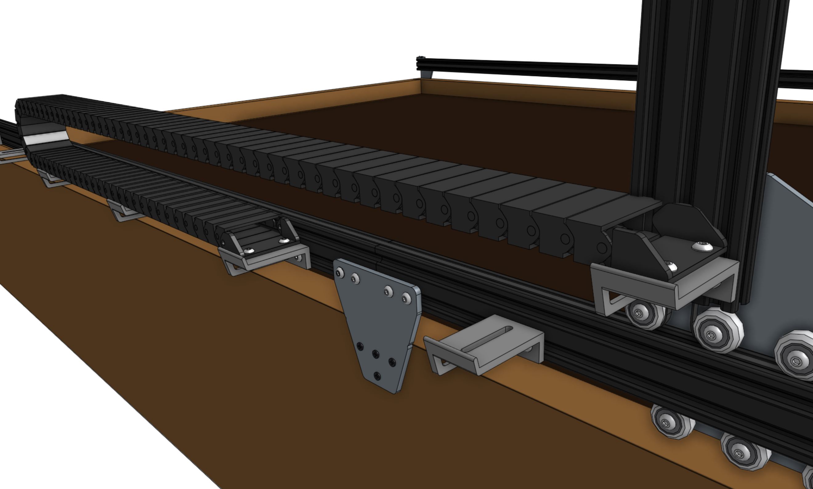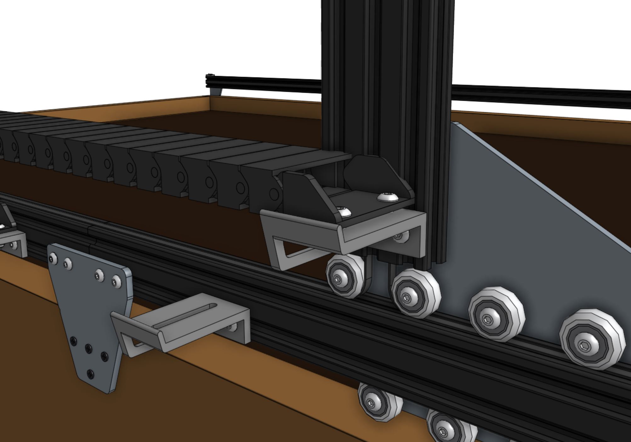There is only one orientation that the x-axis cable carrier mounts to the gantry and tracks, and it is determined by the orientation of the end pieces. Lay the cable carrier onto the track’s horizontal cable carrier supports but do not attach it at this time.