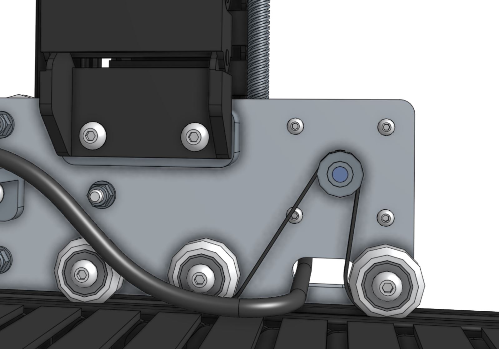 Attach the y-axis cable carrier to the horizontal cable carrier support nearest the gantry using two M5 x 16mm screws, M5 washers, and M5 locknuts.