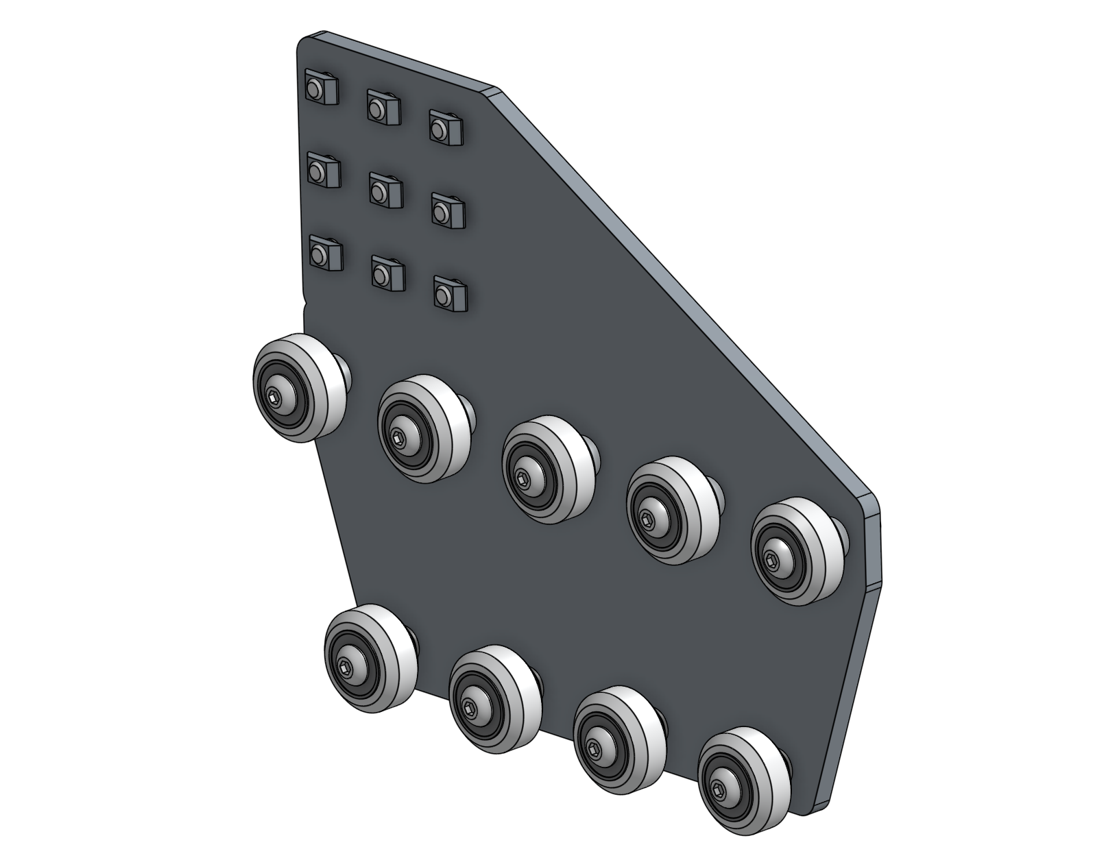 Insert nine M5 x 10mm screws into the gantry wheel plate and loosely attach M5 tee nuts onto the screws. The tee nuts should reside on the same side of the plate as the V-wheels.