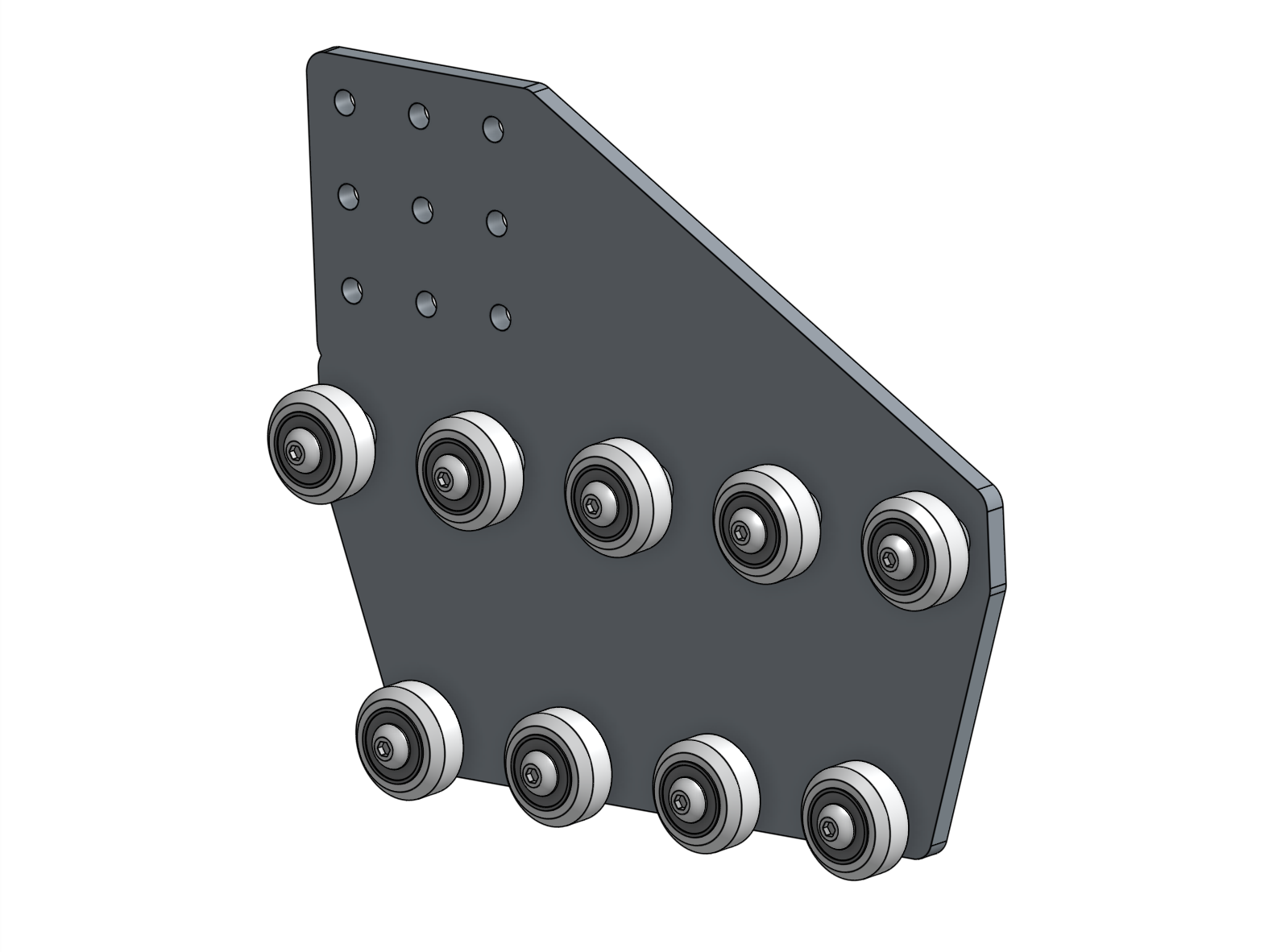 Before we start assembly, know that each completed gantry wheel plate will have nine wheel assemblies attached to it that allow it to slide along the tracks. The five wheels that ride on the top of the tracks will be attached to the plates with standard spacers. The four wheels that ride underneath the tracks will be attached to the plates with eccentric spacers. The eccentric spacers will be used to finely adjust the spacing between the top and the bottom wheels such that the gantry will roll smoothly and snuggly along the tracks.