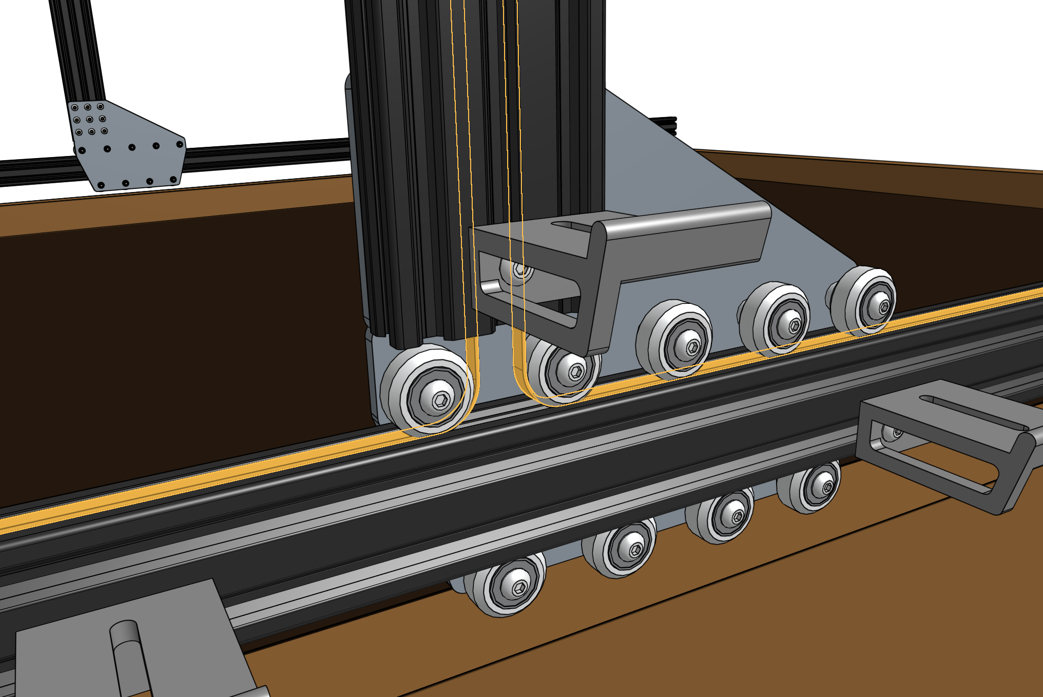 Grab the ends of the belt at the bottom of the gantry column and feed them under the V-wheels of the gantry wheel plate, then along the top of the track extrusions to the ends of the tracks. The flat side of the belt should be in contact with the V-wheels.