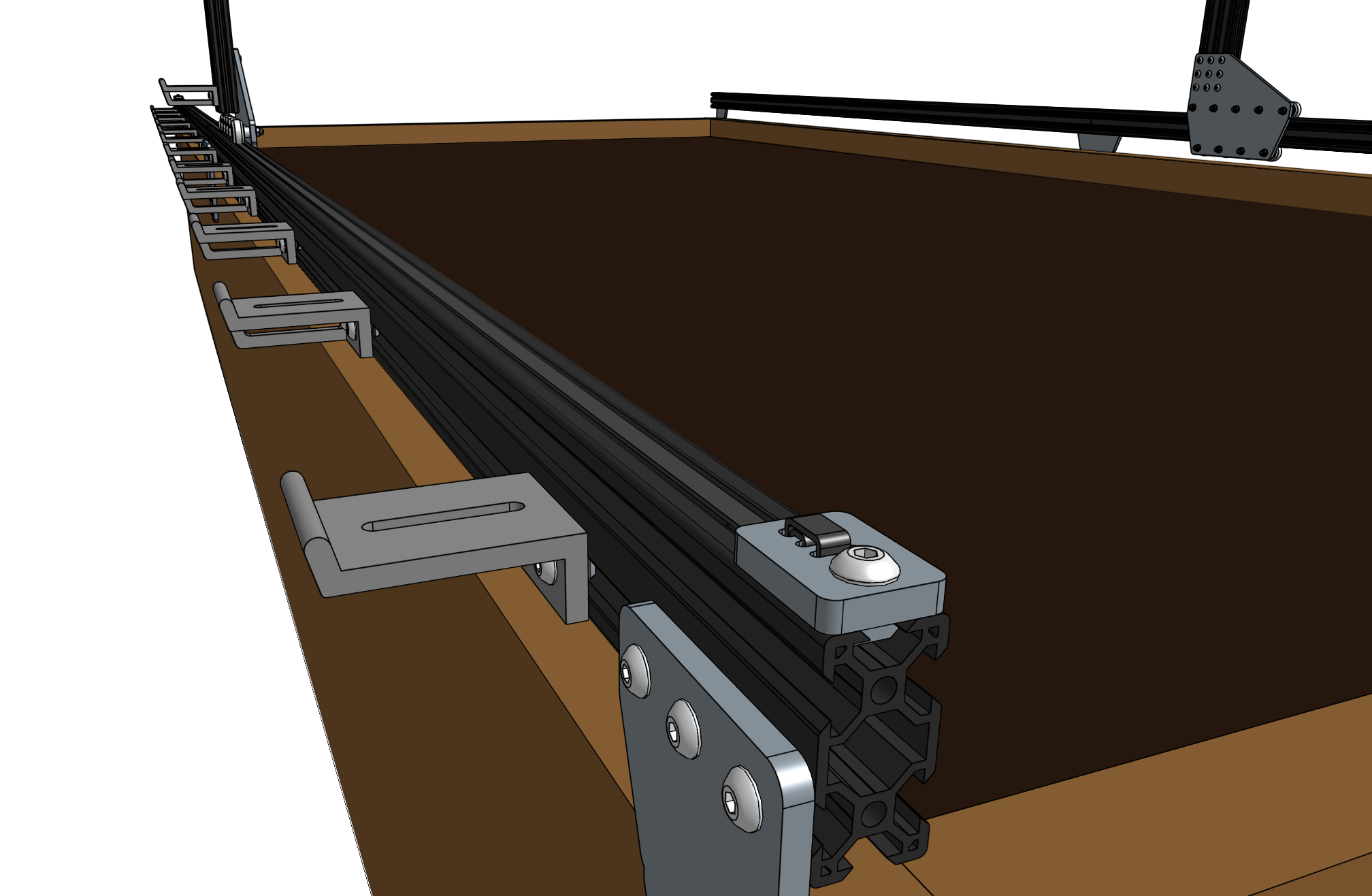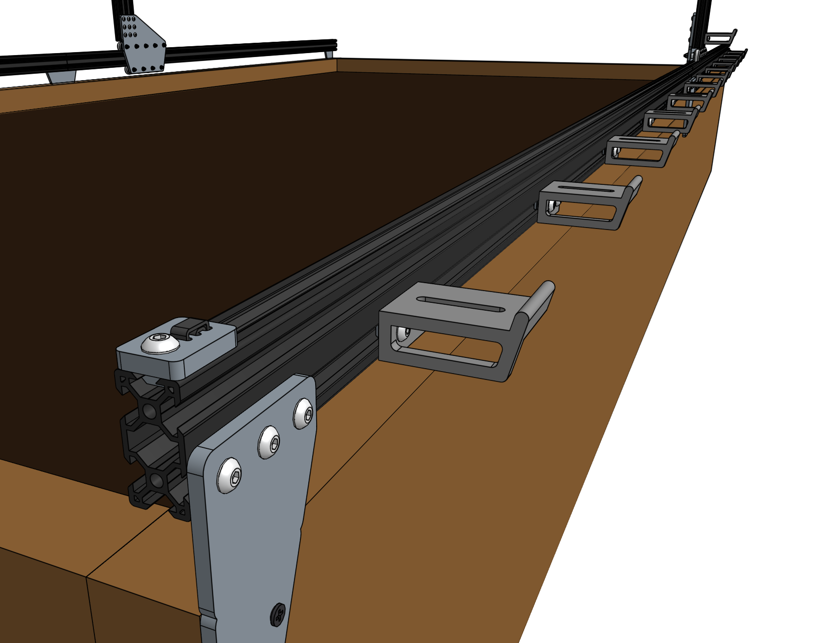 Secure the end of the belt to the front end of the tracks by using a belt clip, M5 x 10mm screw, and M5 tee nut.
