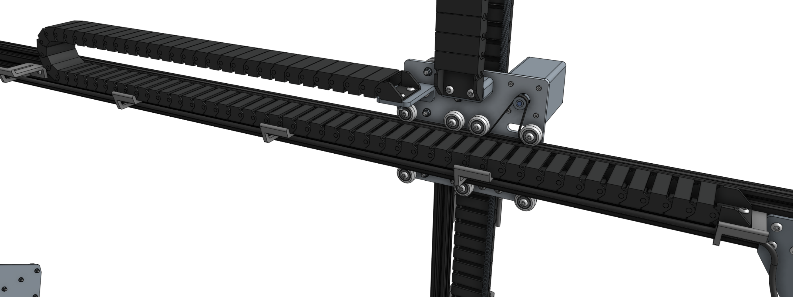 There is only one orientation that the y-axis cable carrier mounts to the cross-slide and gantry, and it is determined by the orientation of the end pieces. Lay the cable carrier onto the gantry’s horizontal cable carrier supports but do not attach it at this time.