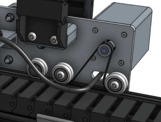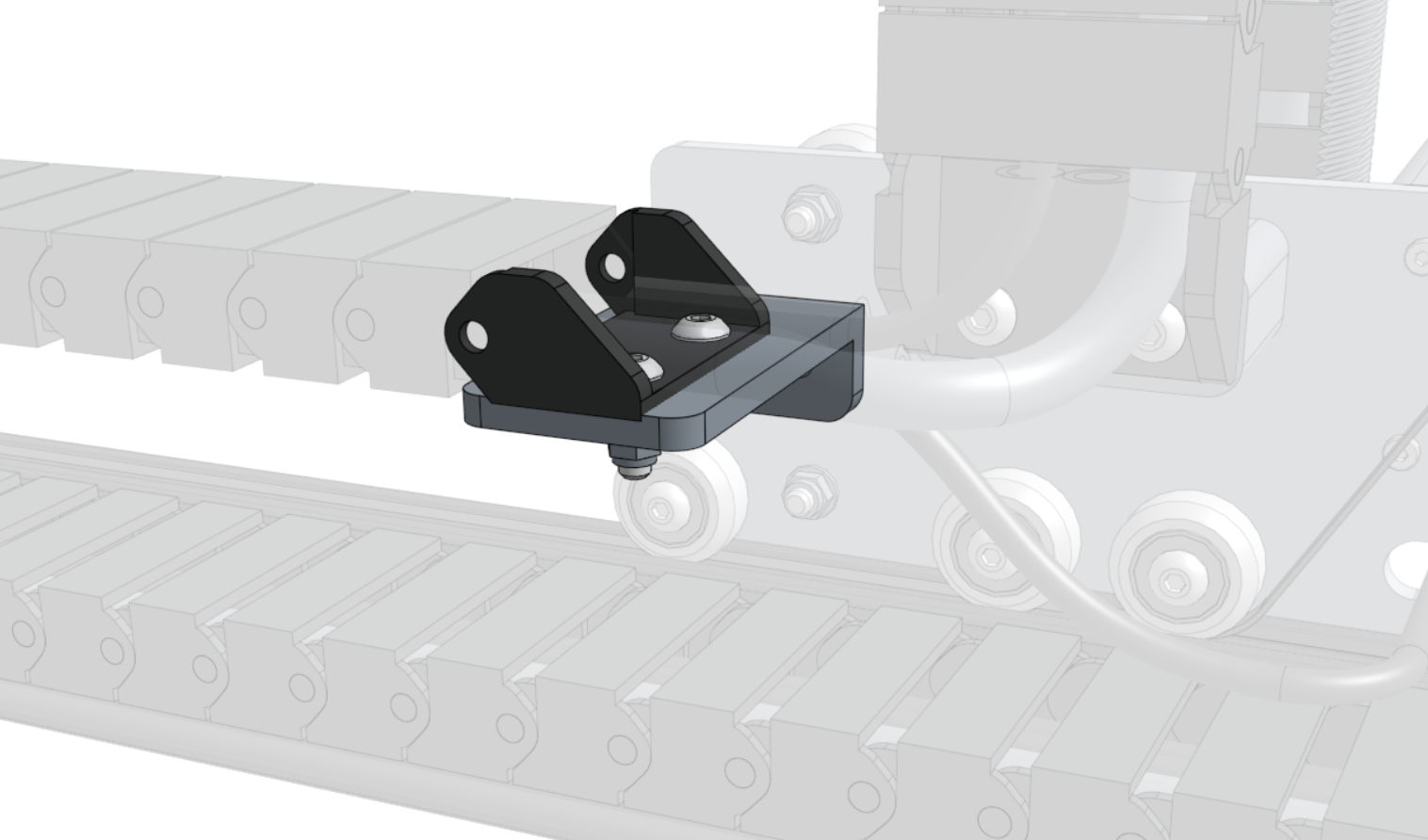 Attach the y-axis cable carrier to the long cable carrier mount using two M5 x 16mm screws, M5 washers, and M5 locknuts.