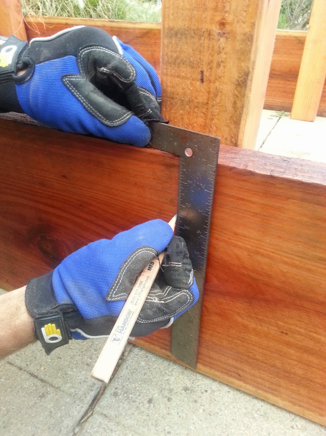 Measure out and mark where the posts will be. Remember this must correspond to where you dug your post holes!