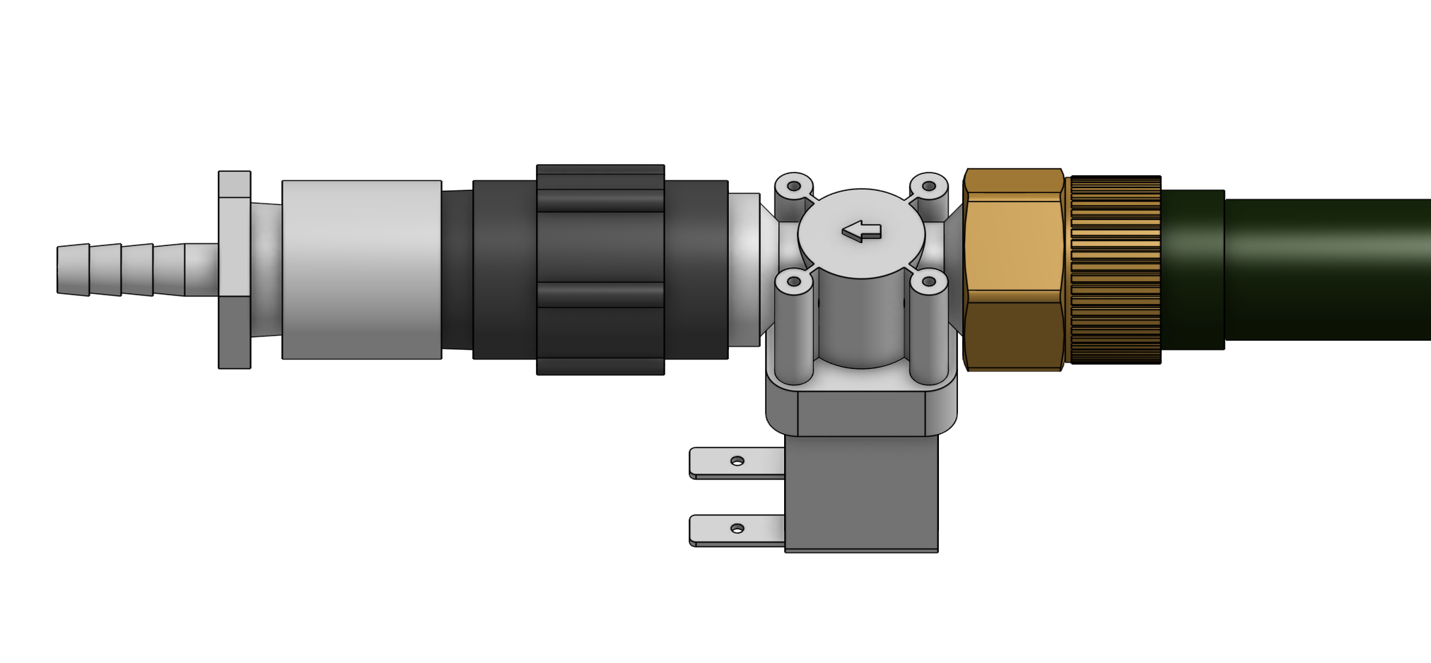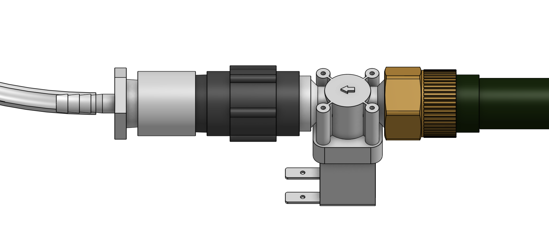 Screw the solenoid valve inlet into the garden hose adapter. Use PTFE tape to seal the threads according to the reference guide.