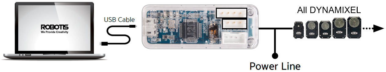 U2D2 is a small size USB communication converter that enables to control and operate DYNAMIXEL with PC. Connect the U2D2 to the PC via USB hub.