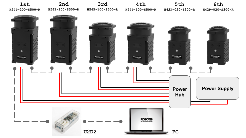 - DYNAMIXEL-P is powered from a a power supply via power expansion hub.