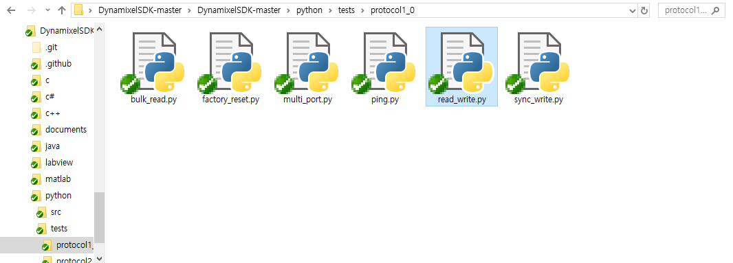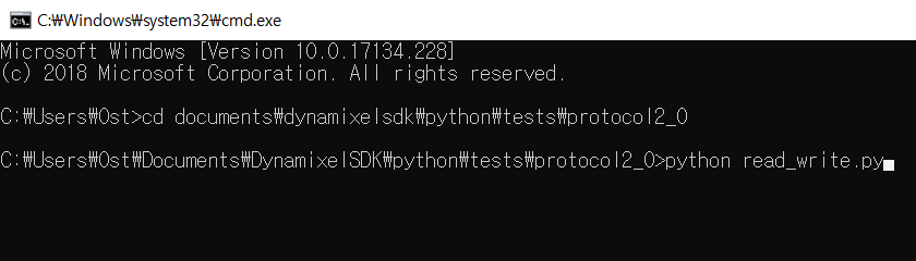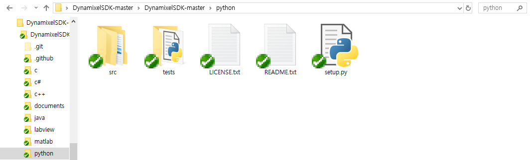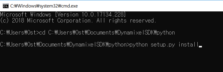 DynamixelSDK folder] following command on the command prompt. (cd [DynamixelSDK folder]\python). Run setup.py by entering following command on the command prompt (python setup.py install).
