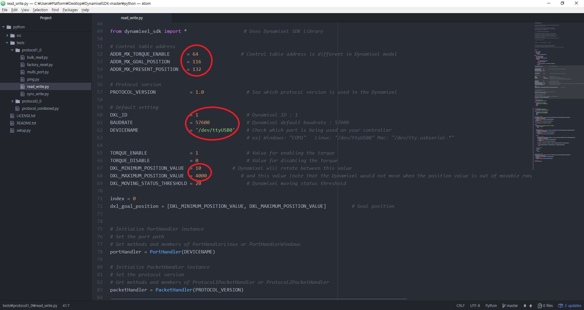 pythonfolder withAtom. Modify the settings that is needed for the Dynamixel control.