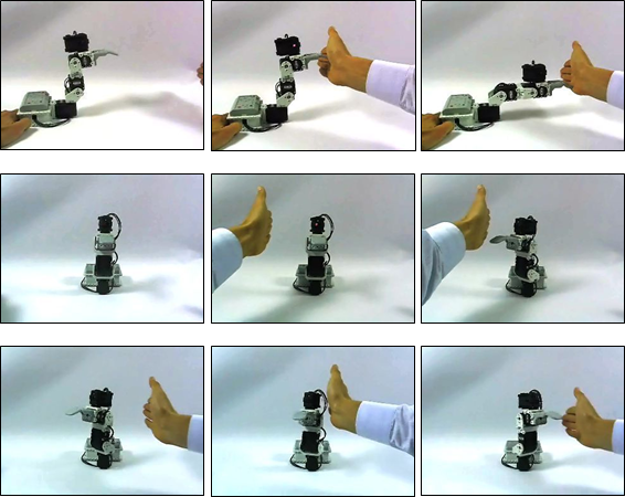 - 조립확인 태스크 코드 Download - 데모용 태스크 코드 Download - 데모용 모션 파일 Download - 동영상 - 다이나믹셀 설정값: AX-12+ ID[1], ID[2], ID[3], ID[4], ID[5], ID[6], ID[7] : 관절모드 AX-S1 ID[100] - 동작방법 : 아무 변화가 없을 때, 아기 사슴은 앉아서 두리번거립니다. 얼굴에 물체를 대면, 그 물체를 계속 쫓아옵니다. |