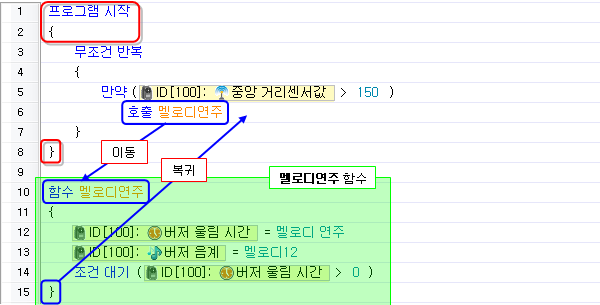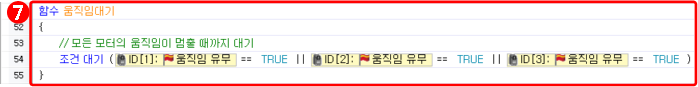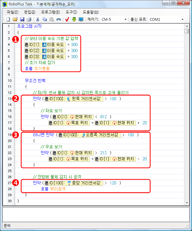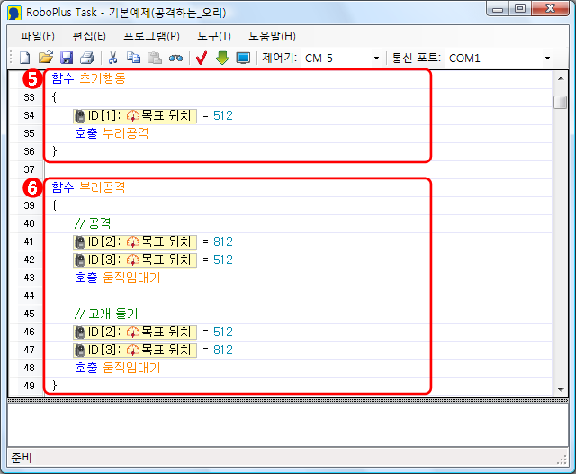 ID[2], ID[3] 관절의 적절한 목표 위치 값을 입력시켜 공격 동작과 고개 들기(준비 동작) 동작을 만듭니다. 각 동작이 끝날 때까지 행동제어 프로그램의 진행을 잠시 중단시킬 수 있는 움직임대기(7) 함수도 프로그래밍 합니다.