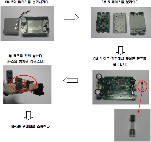 참고 : CM-5 에 사용되는 퓨즈는 일반 전파상에서 쉽게 구할 수 있습니다.(퓨즈의 용량 : 220V/5A)