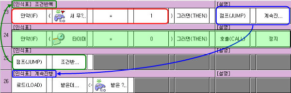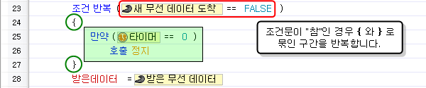 프로그램 시작의 { 와 } 사이 구간의 빈 줄을 더블클릭 하거나 선택 후 Enter 키를 누르면 명령어 종류 선택 창이 뜹니다. 명령어 종류 중 “반복문 > 무조건 반복 (while(1))” 을 선택합니다.