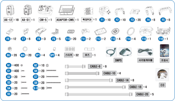 - 1자유도의 간단한 차단바에서부터 18자유도의 거미로봇, 휴머노이드까지 직접 제작하고, 예제프로그램을 편집해 봄으로서 프로그래밍에 대한 이해도를 높일 수 있습니다.