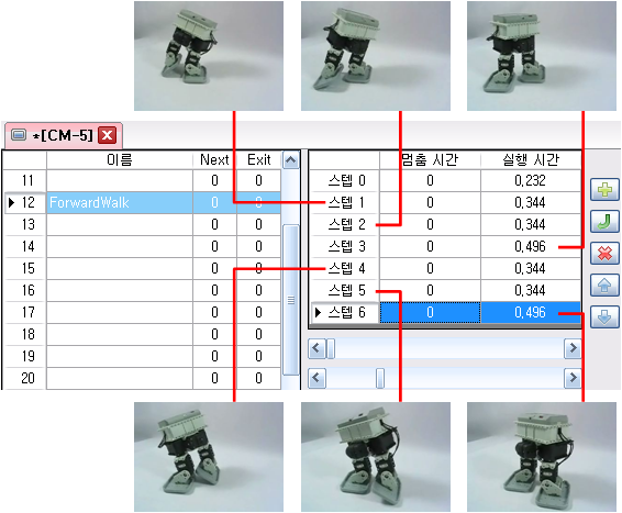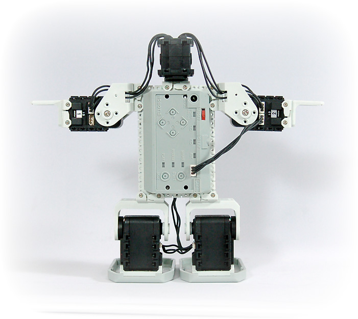 - 조립확인 태스크 코드 Download - 데모용 태스크 코드 Download - 데모용 모션 파일 Download - 동영상 - 다이나믹셀 설정값: AX-12+ ID[1]~ ID[18] : 관절모드 AX-S1 ID[100] - 동작방법 : CM-5 의 시작 버튼을 누르고 박수를 치면 춤을 추기 시작합니다. CM-5 의 U 버튼을 누르고 박수를 치면 따라 치고, 전방에 물체가 감지되면 인사를 합니다. CM-5 의 L 버튼을 누르면 공격 자세를 취하다가 물체가 감지되면 공격을 합니다. CM-5 의 D 버튼을 누르면 스스로 장애물을 피하면서 걸어갑니다. 로봇이 누웠을 때 박수를 3번 이상 치면 스스로 일어납니다. |