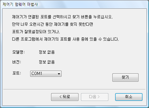 사용자가 제어기가 연결된 포트를 수동으로 설정해 주어야 합니다. 포트가 사용중이면 제어기를 인식할 수 없으니 다른 프로그램을 종료하고 진행하십시오. 제어기가 연결된 포트를 선택하고 찾기 버튼을 누르십시오.