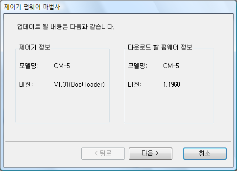 제어기를 찾으면 현재 제어기의 정보와 다운로드 할 펌웨어 정보가 나옵니다. 모델명이 사용자가 연결한 제어기가 맞는지 확인하십시오. (제어기 정보의 버전은 펌웨어 버전이 아니고 부트로더(Boot Loader)의 버전입니다.)
