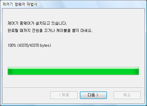 다음 버튼을 누르면 펌웨어 복구를 시작합니다. 완료될 때까지 전원이 꺼지거나 케이블이 빠지지 않도록 주의하십시오.