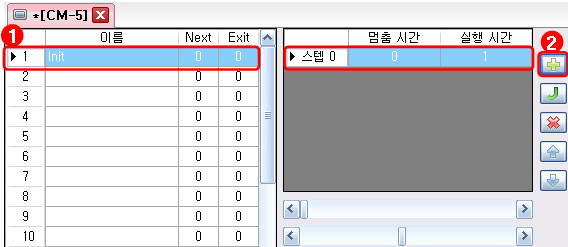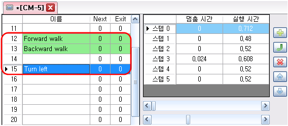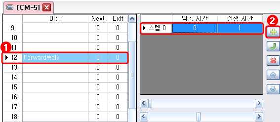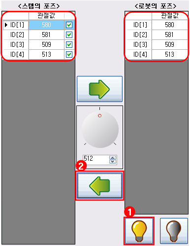 초기 행동은 ID[1] 관절에 적절한 목표 위치 값(512)을 넣어 주둥이를 가운데로 이동한 뒤 부리 공격을 한 번 호출 하여 초기 자세를 잡도록 구성합니다. - 공격 행동 만들기