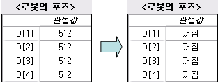 - 다시 관절 모드로 설정하려면, CW/CCW 위치 제한 컨트롤 테이블 값을 0 이외의 값으로 설정하면 됩니다. 관절 모드 기본값은 CW 위치 제한 : 0, CCW 위치 제한 1023입니다.