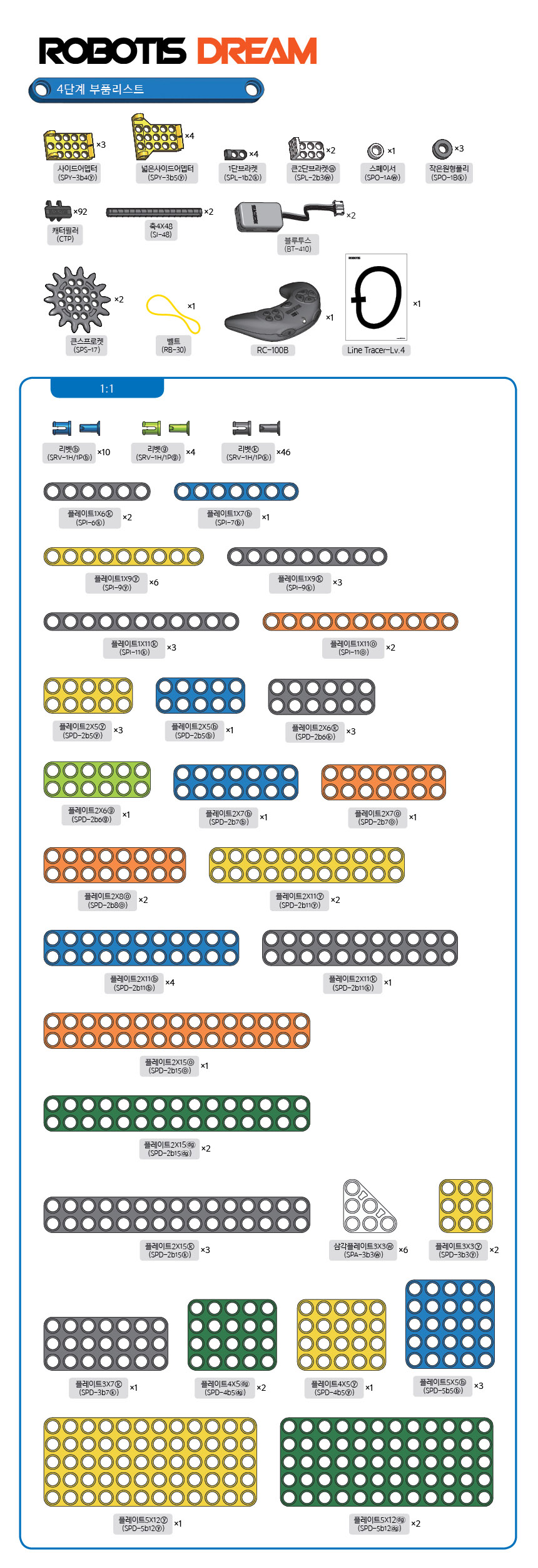 로보티즈 드림 4단계는 1,2,3단계 키트와 결합되어 총 12개의 예제 로봇을 만들 수 있습니다. 또한 교재에는 12개의 예제 로봇을 만들 수 있는 조립서와 예제 로봇들의 제어 프로그램, 부품들의 활용, 원리의 이해, 문제풀이 등의 과정을 제공합니다.