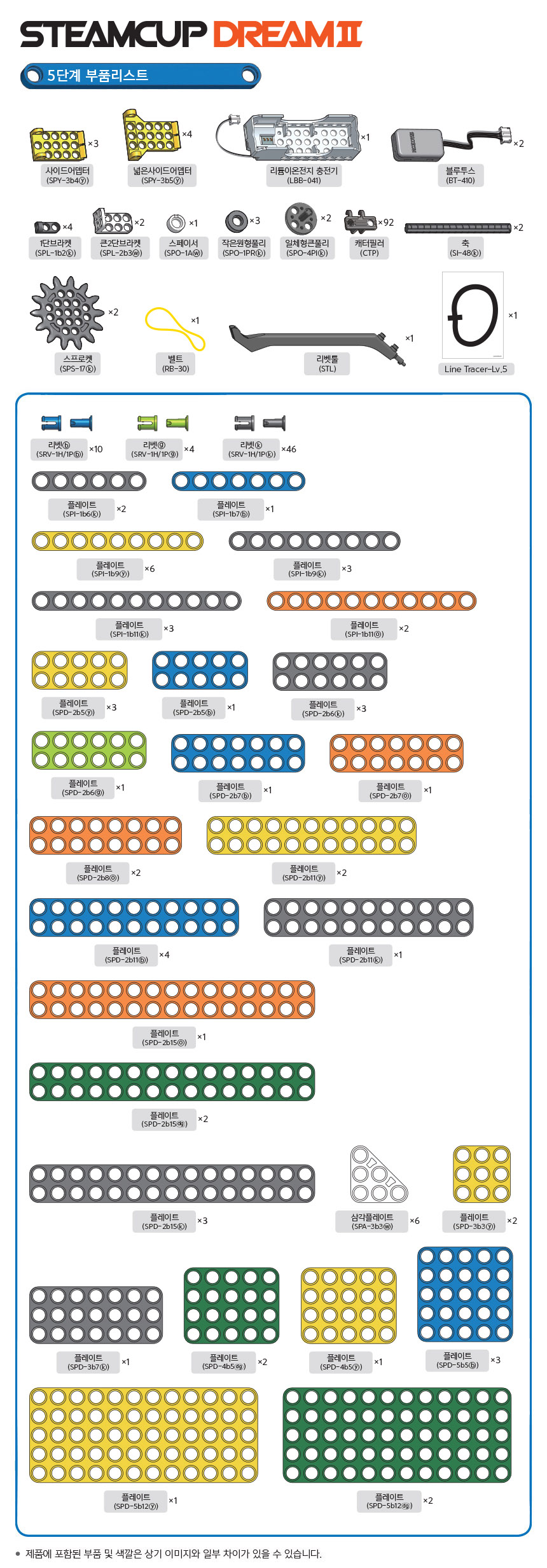 - STEAMCUP DREAMII 5단계는 1,2,3,4단계 키트와 결합되어 총 12개의 예제 로봇을 만들 수 있습니다. 각 장마다 순서대로 로봇을 만들면서 제어 프로그램과 센서들의 활용, 원리의 이해, 문제풀이 등의 과정을 제공합니다.