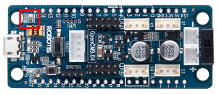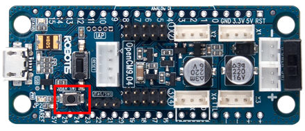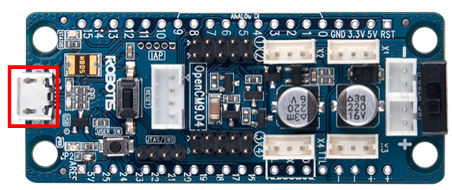 3. 사용자 버튼이 눌린 상태에서 표시된 부분에 mini USB 케이블로 OpenCM9.04C와 PC를 연결합니다.