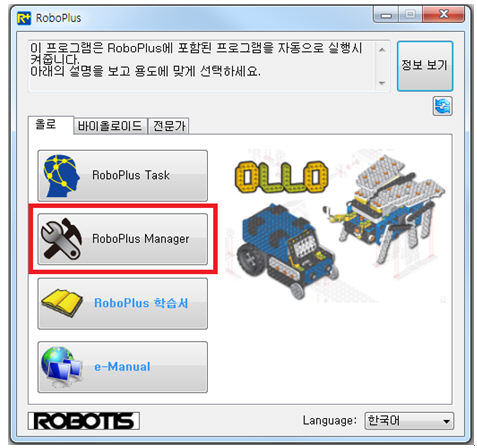 5. RoboPlus를 실행합니다. 버전이 낮을 경우 인터넷에 연결하여 자동업데이트가 실행됩니다. 자동업데이트가 불가능 할 경우에는 로보티즈 다운로드 게시판에서 최신버전을 설치하도록 하세요.
