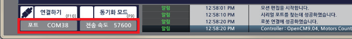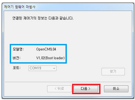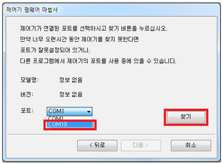 11. OpenCM9.04C가 연결된 COM포트 번호를 선택하고 [찾기]를 클릭합니다.