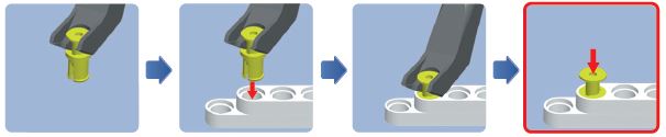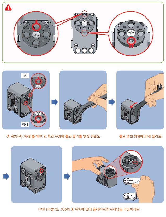 다이나믹셀 XL-320에 프레임을 결합할 때에는 조립서에 표시된 혼의 위,아래 표시를 확인하고 결합합니다.