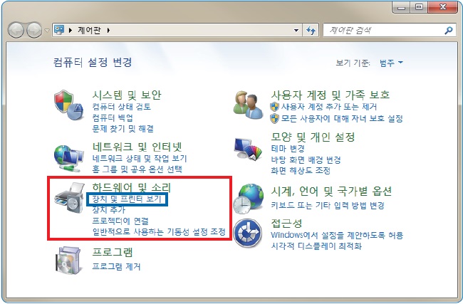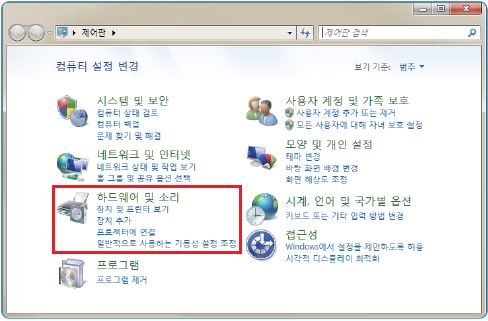 1. PC의 제어판에 하드웨어 및 소리에서 장치 및 프린터 보기를 선택합니다.