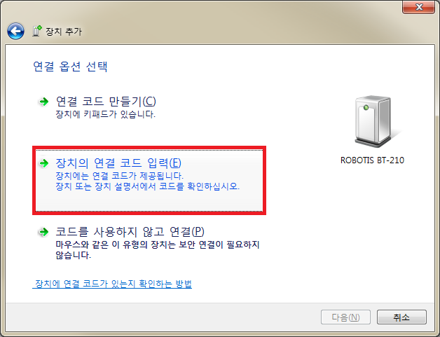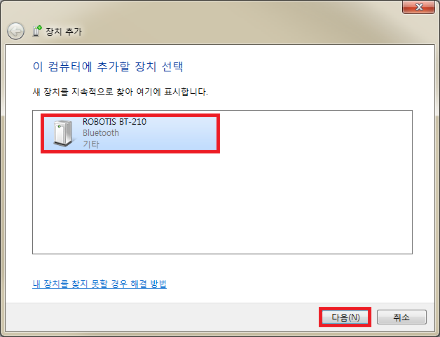 3. 검색된 장치 중에 로봇에 연결한 블루투스(BT-210)를 선택하고 다음을 누릅니다.