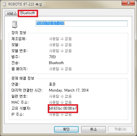 Bluetooth 탭의 고유 식별자가 블루투스(BT-210)의 상단에 적힌 번호와 일치하는지 확인하세요.