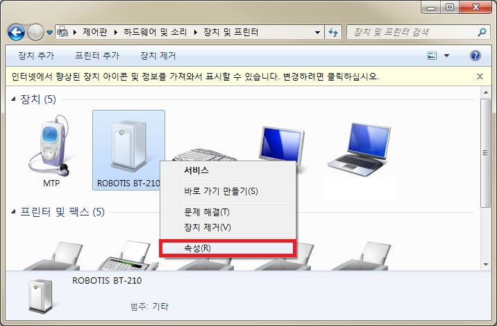 2. 앞에서 연결한 장치를 마우스의 오른쪽을 클릭하여 속성 메뉴를 선택합니다.
