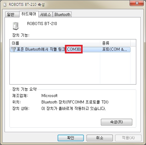 3. 하드웨어 탭에서 직렬 링크 COM 포트번호를 확인합니다.