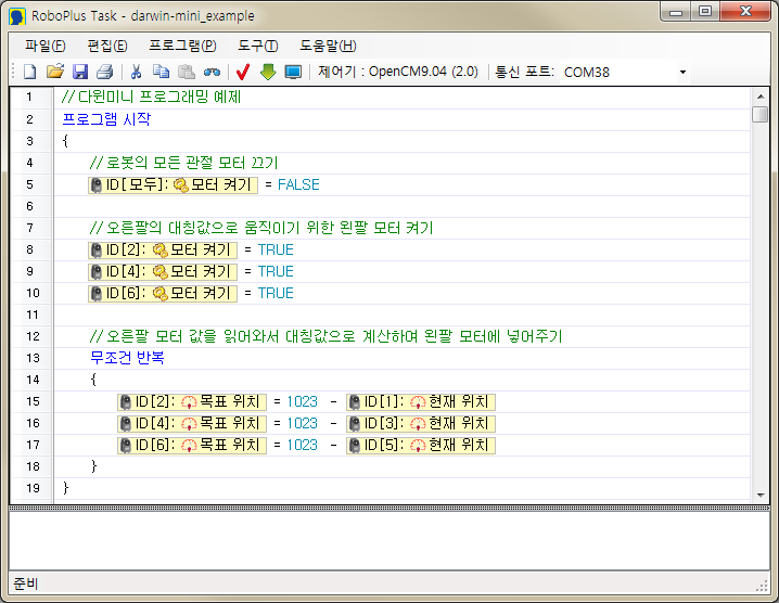 로봇이 해야 할 태스크를 프로그래밍한 소스를 RoboPlus에서는 태스크 코드(Task Code)라고 합니다.