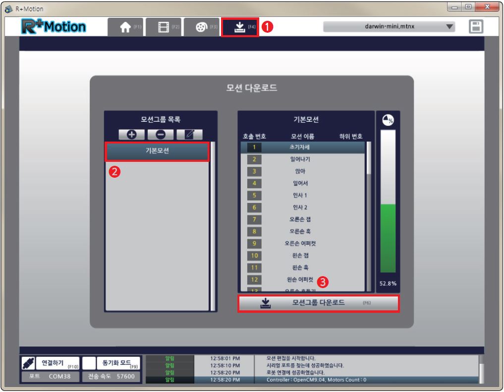수정한 모션 파일을 로보티즈 미니 앱이나 태스크 코드에서 활용할 수 있도록 로봇에 다운로드합니다. 모션 데이터도 다운로드를 하게 되면 태스크 코드와 마찬가지로 제어기 내부에 저장되므로 한 번만 수행하면 됩니다.
