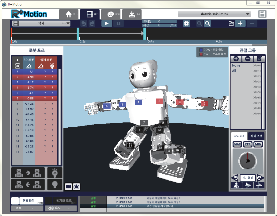 실제 로봇을 연결하거나 3D 로봇을 이용하여 로봇의 모션 데이터를 쉽게 만들 수 있도록 도와주는 것이 로보플러스 모션 프로그램입니다.