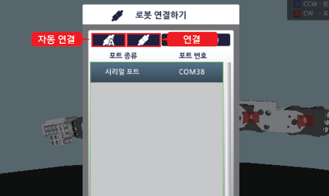 화면의 오른쪽 위에 설정 메뉴에서 관절 동작 테스트를 터치합니다. 스마트기기가 STEAMCUP MINI와 연결되어 있으면 다음과 같이 화면에 STEAMCUP MINI의 모습이 나타납니다.