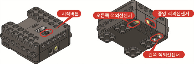 - 적외선 센서 : 3개의 적외선 센서가 장착되어 있어 각 방향에서의 센서값을 이용하여 프로그래밍 할 수 있습니다.