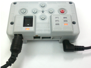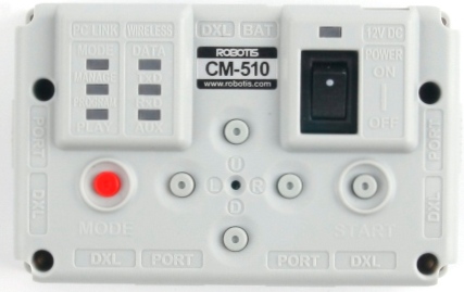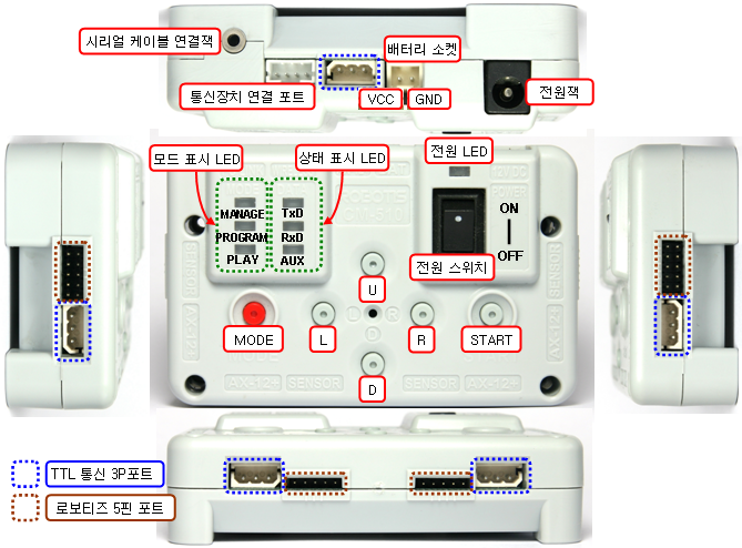 - 시리얼 케이블 연결잭 : 시리얼 케이블로 CM-510 과 PC 의 시리얼 포트를 연결하는 포트입니다. 태스크 코드 다운로드 또는 PC와의 통신용으로 사용됩니다.