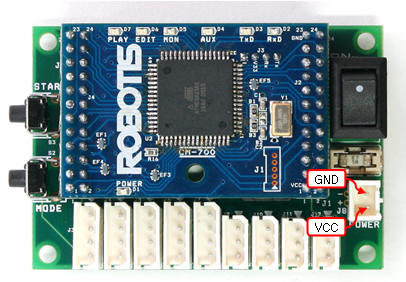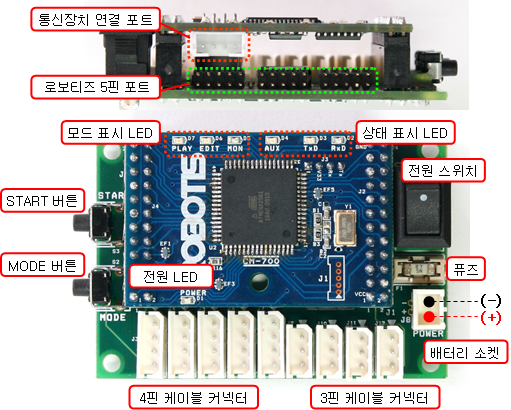 CM-700 은 마이크로 컨트롤러가 포함된 CM-700 과 전원부 및 각종 커넥터 등이 포함된 SUB 보드로 나뉘어집니다. 각 보드의 연결에 따라 동작 전압의 범위가 달라질 수 있으므로 아래 내용을 참고하여 배터리를 제작하시면 됩니다.