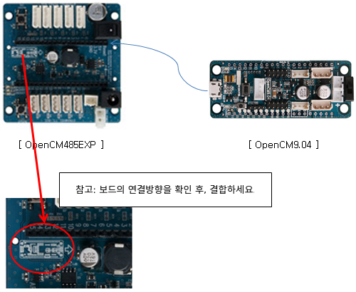 OpenCM 485 확장보드 와 OpenCM9.04를 아래의 그림과 같이 연결 합니다.