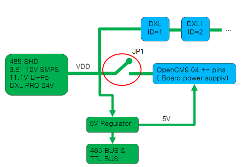 OpenCM 485 확장보드 와 OpenCM9.04 연결시 전원 블록 다이어그램